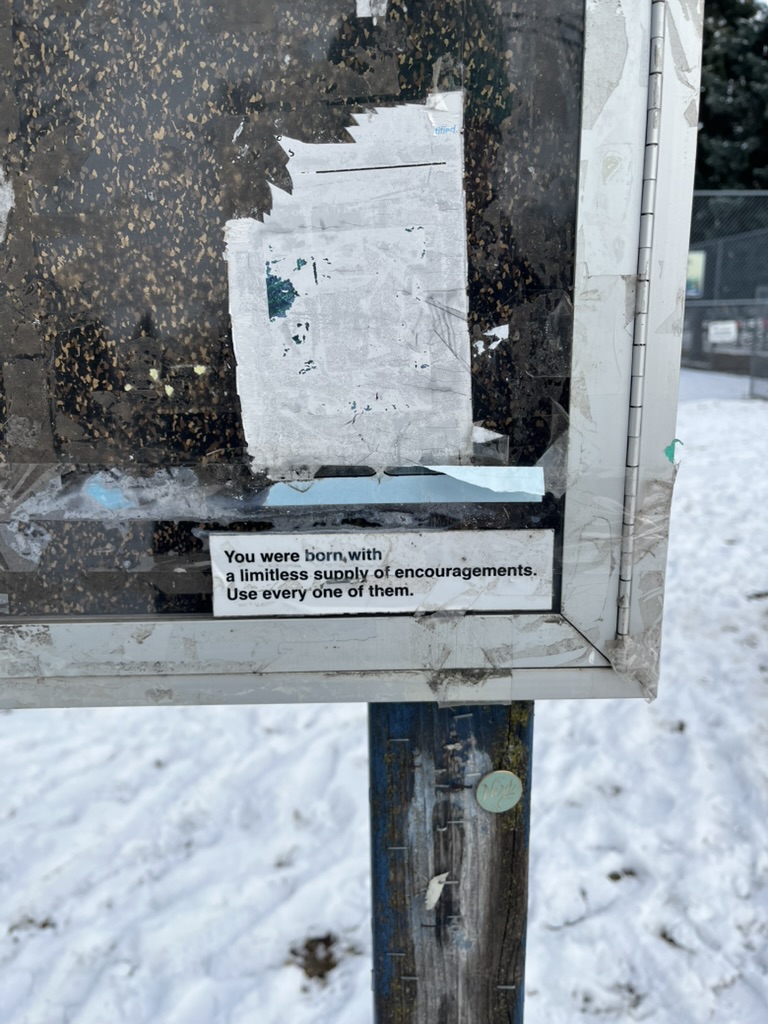 Last winter I noticed this small innocuous bit of paper taped to a neighbourhood post-board. On it were the words I have quoted above. It sticks with me to this day and comes to mind … >